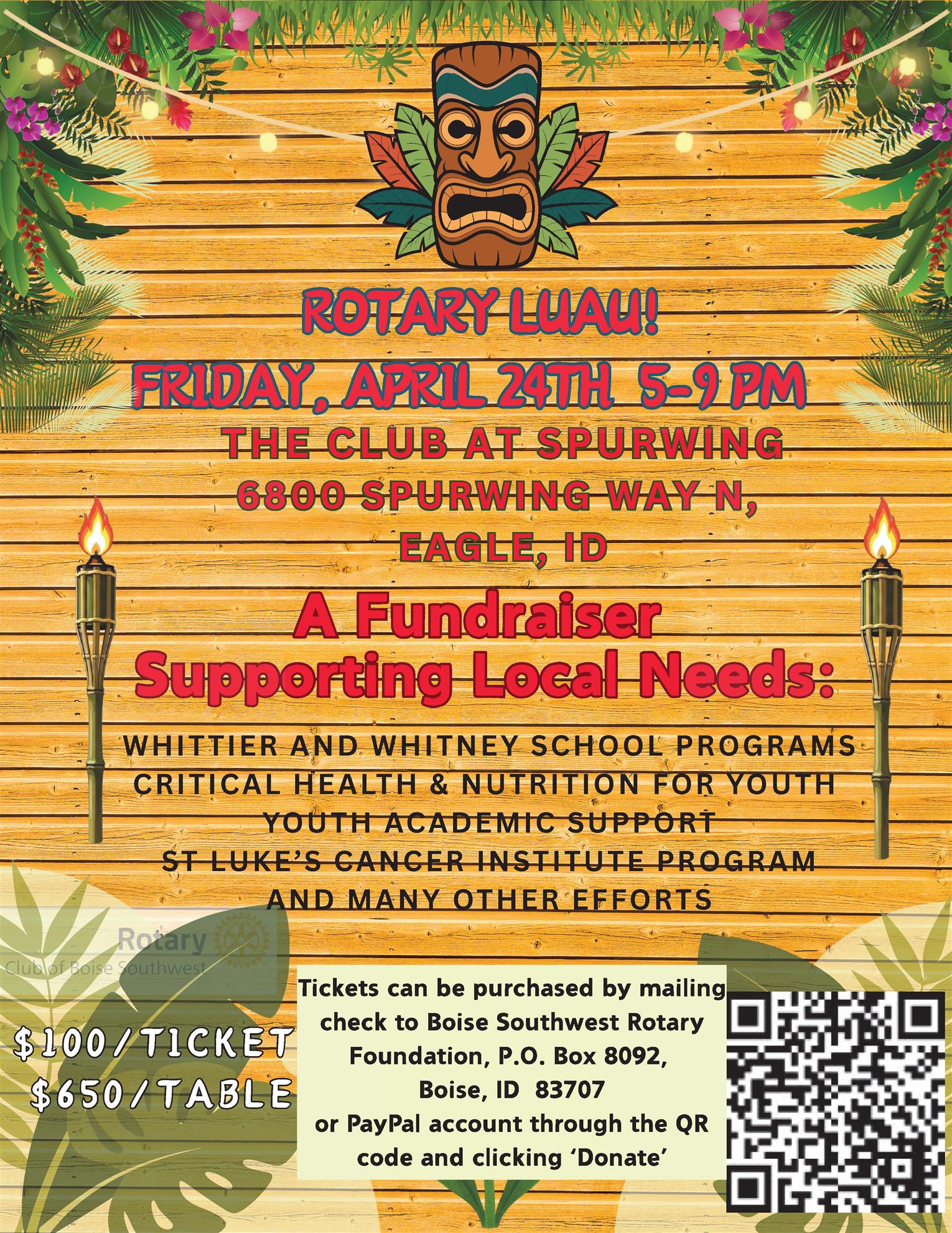 Join us for the third annual Boise Southwest Rotary Luau! On Friday, April 24th join us for a fun evening for a purpose! This year, the event will be held at Spurwing Country Club, 6800 Spurwing Way N in Eagle, Idaho. There will be delicious Hawaiian food, a robust auction and fun! Funds raised will support the projects of Boise Southwest Rotary and our Foundation, including Whittier and Whitney Elementary School programs, St. Luke's Cancer Institute patients and many other worthy causes. Tickets are $100 each, or $650 for a table of eight.